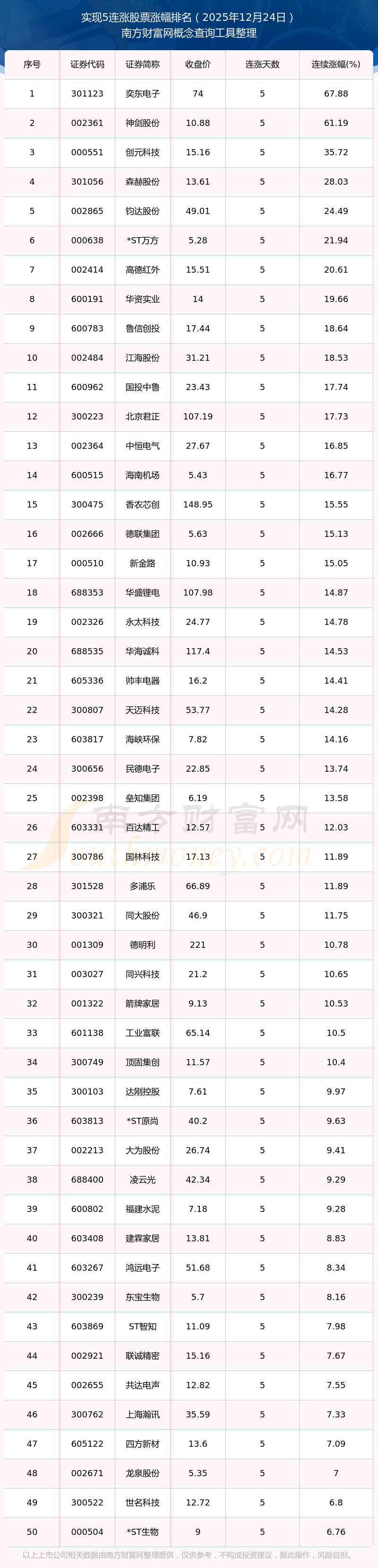 2025年12月24日實現(xiàn)5連漲股票漲幅排名