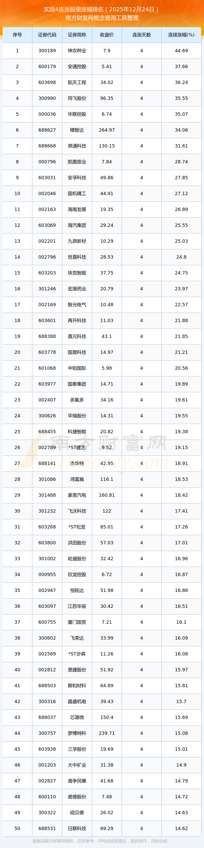 根據(jù)南方財富網(wǎng)概念查詢工具數(shù)據(jù)統(tǒng)計(jì),截止2025年12月24日收盤,共有291只個股實(shí)現(xiàn)4天連漲。其中連續(xù)漲幅較大的個股有神農(nóng)種業(yè)、安通控股、航天工程等,連續(xù)漲幅分別為44.69%、37.66%、36.24%。