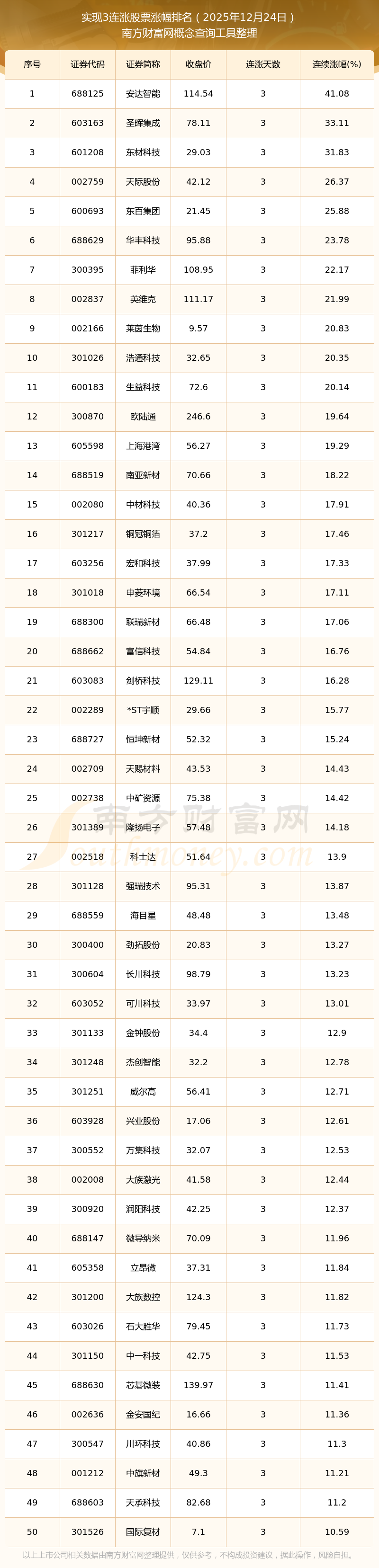 根據(jù)南方財(cái)富網(wǎng)概念查詢工具數(shù)據(jù)統(tǒng)計(jì),截止2025年12月24日收盤(pán),共有210只個(gè)股實(shí)現(xiàn)3天連漲。其中連續(xù)漲幅較大的個(gè)股有安達(dá)智能、圣暉集成、東材科技等,連續(xù)漲幅分別為41.08%、33.11%、31.83%。
