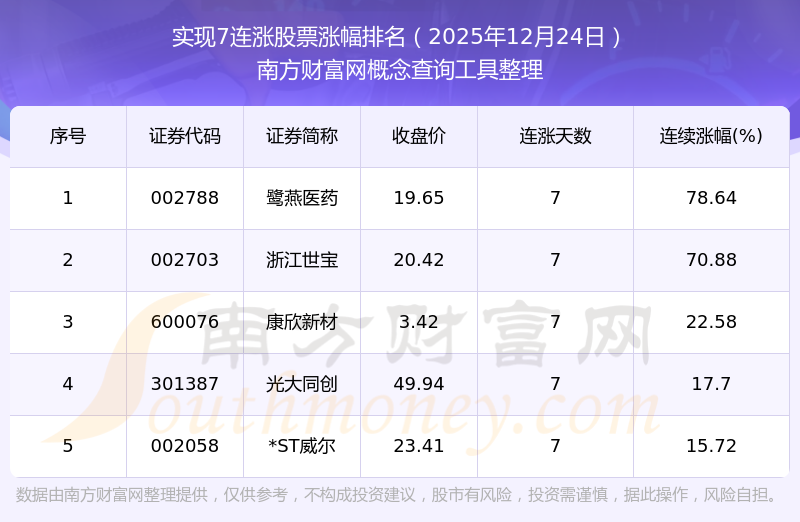 2025年12月24日實現(xiàn)7連漲股票漲幅排名