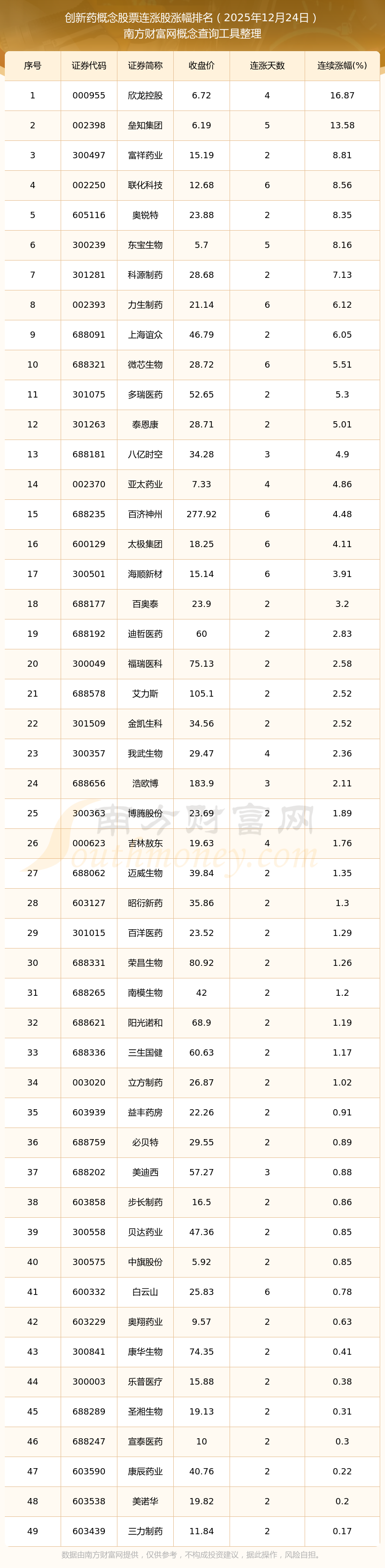 根據(jù)南方財(cái)富網(wǎng)概念查詢工具數(shù)據(jù)統(tǒng)計(jì),截止2025年12月24日收盤,創(chuàng)新藥概念股票共有49只個(gè)股實(shí)現(xiàn)連漲。其中連續(xù)漲幅較大的個(gè)股有欣龍控股、壘知集團(tuán)、富祥藥業(yè)等,連續(xù)漲幅分別為16.87%、13.58%、8.81%。