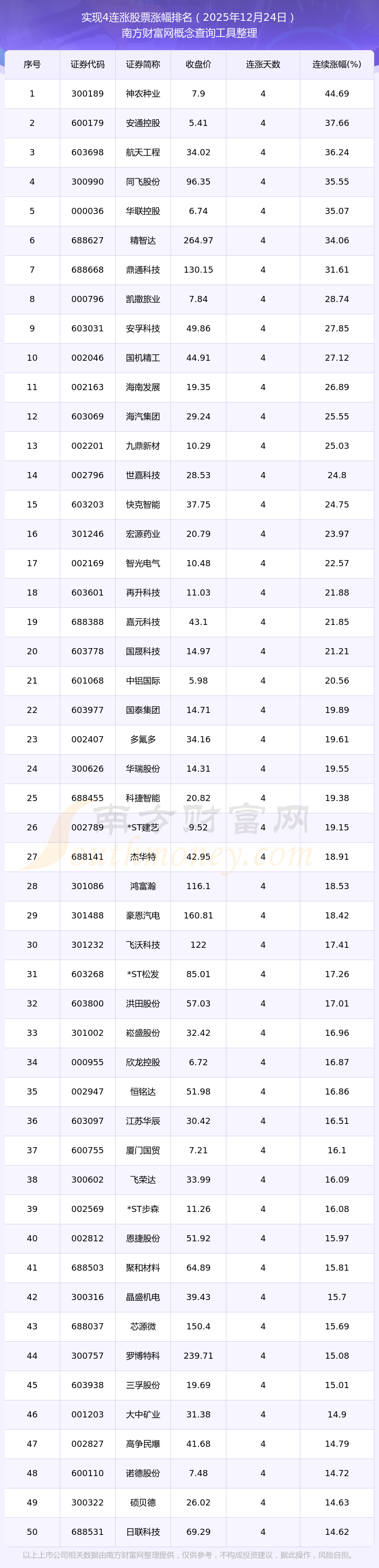 根據(jù)南方財富網(wǎng)概念查詢工具數(shù)據(jù)統(tǒng)計,截止2025年12月24日收盤,共有291只個股實現(xiàn)4天連漲。其中連續(xù)漲幅較大的個股有神農(nóng)種業(yè)、安通控股、航天工程等,連續(xù)漲幅分別為44.69%、37.66%、36.24%。