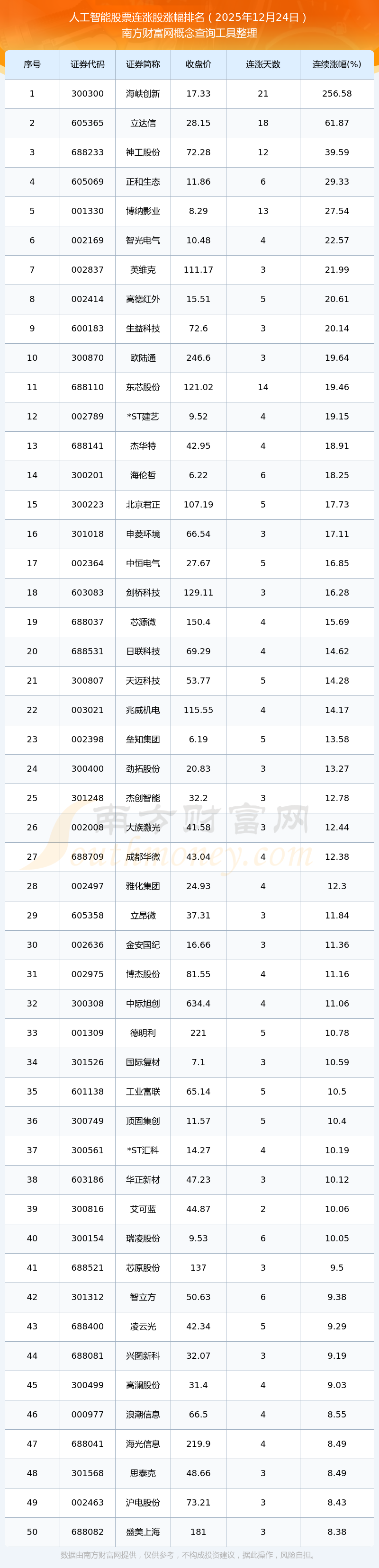 根據(jù)南方財(cái)富網(wǎng)概念查詢工具數(shù)據(jù)統(tǒng)計(jì),截止2025年12月24日收盤,人工智能股票共有164只個(gè)股實(shí)現(xiàn)連漲。其中連續(xù)漲幅較大的個(gè)股有海峽創(chuàng)新、立達(dá)信、神工股份等,連續(xù)漲幅分別為256.58%、61.87%、39.59%。