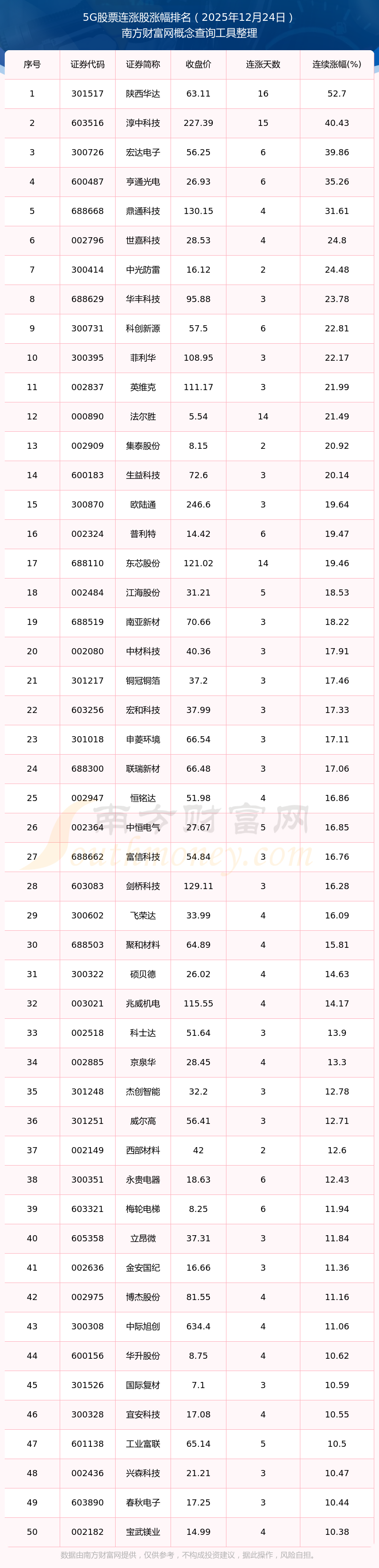 根據(jù)南方財(cái)富網(wǎng)概念查詢工具數(shù)據(jù)統(tǒng)計(jì),截止2025年12月24日收盤,5G股票共有138只個(gè)股實(shí)現(xiàn)連漲。其中連續(xù)漲幅較大的個(gè)股有陜西華達(dá)、淳中科技、宏達(dá)電子等,連續(xù)漲幅分別為52.70%、40.43%、39.86%。