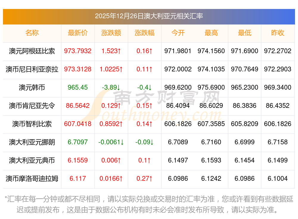 2025年12月26日澳大利亞元相關(guān)匯率查詢