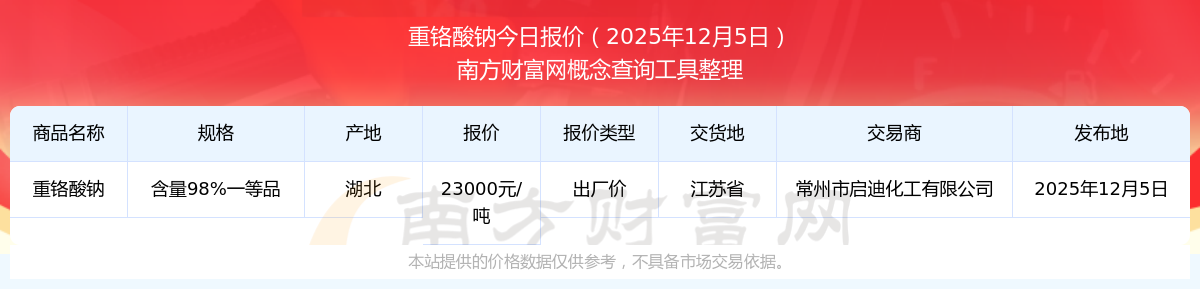 2025年12月5日,重鉻酸鈉(含量98%一等品)出廠價價格為23000.00元/噸,報價人:常州市啟迪化工有限公司,交易地點為江蘇省。