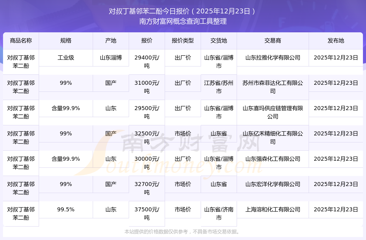 2025年12月23日,對叔丁基鄰苯二酚(含量99.9%)價格為29500.00元/噸,報價人:山東喜瑪供應鏈管理有限公司,交易地點為山東省/淄博市。