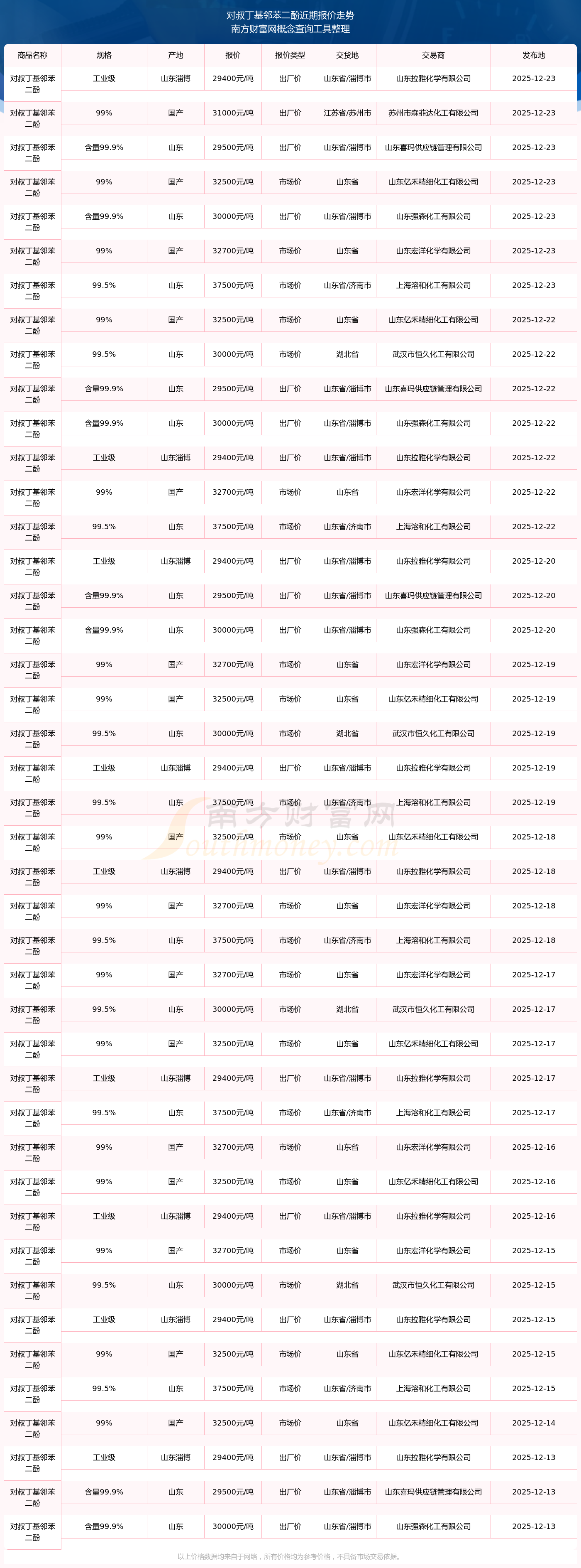 2025年12月23日,蘇州市森菲達化工有限公司對叔丁基鄰苯二酚(99%),國產(chǎn),交易地點為江蘇省/蘇州市,報價為31000.00元/噸。
