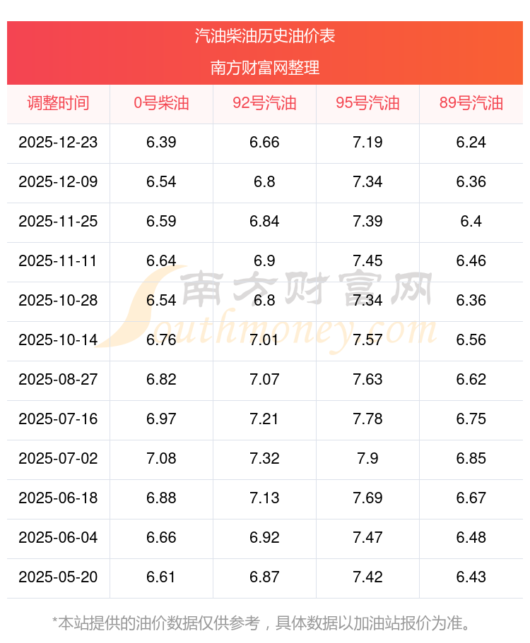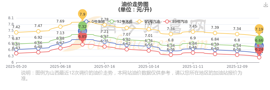 12月26日,晉城95號汽油最新價格為:7.19元每升,調(diào)整時間為12月23日,相對上次調(diào)整時間12月9日的油價7.34元每升,下調(diào)了0.15元,下調(diào)幅達(dá)2.044%。下一輪油價調(diào)整時間12月31日24時,距離現(xiàn)在還有0天。