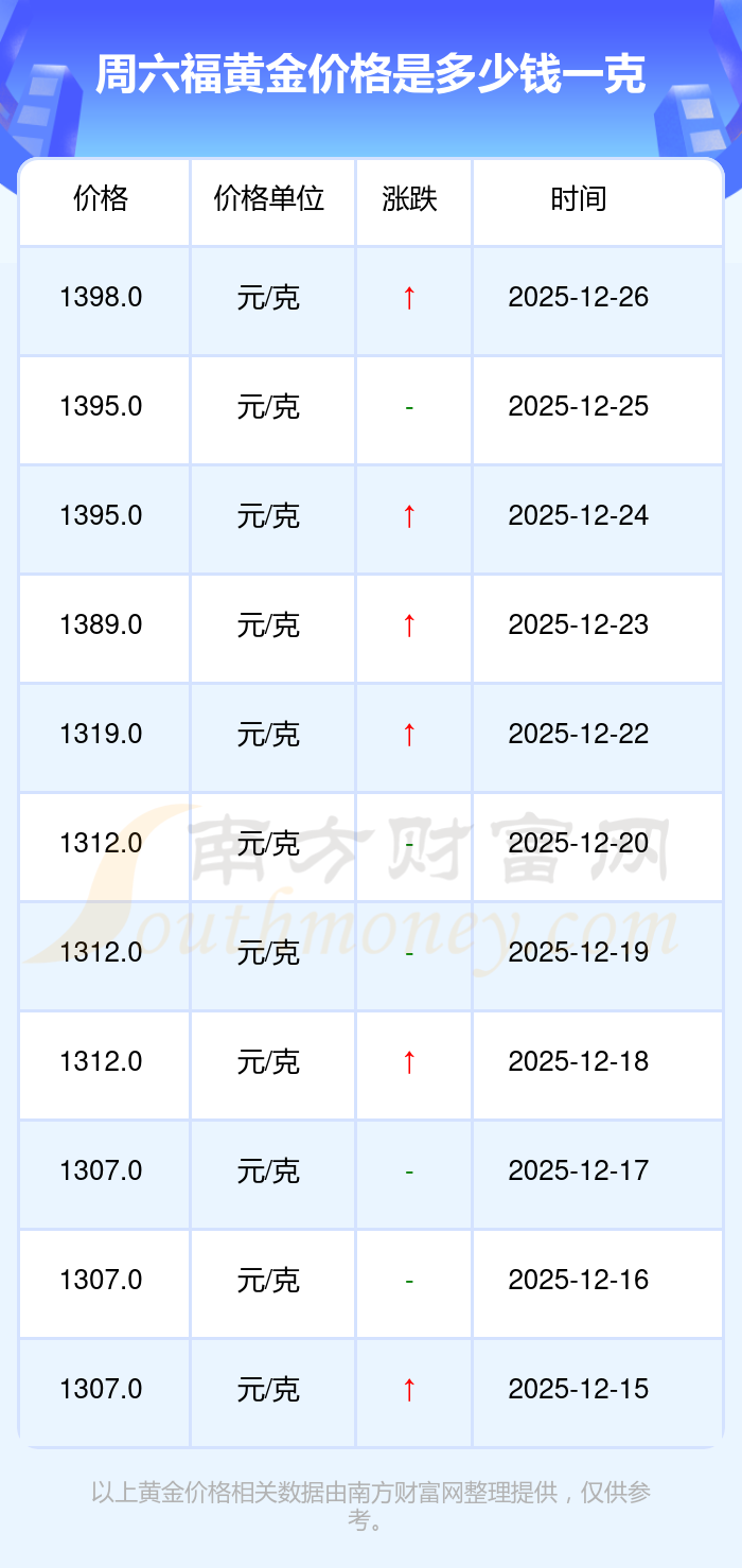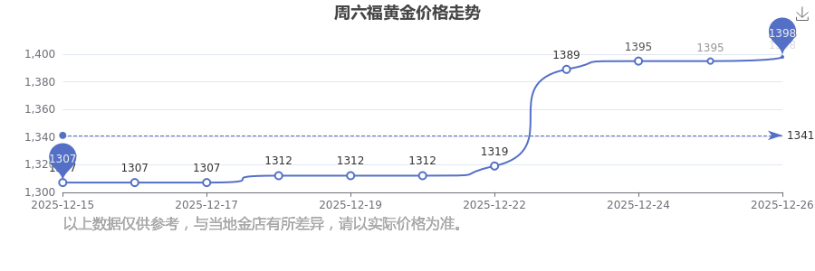 據(jù)了解,周六福今日黃金價格為1398.0元/克。
