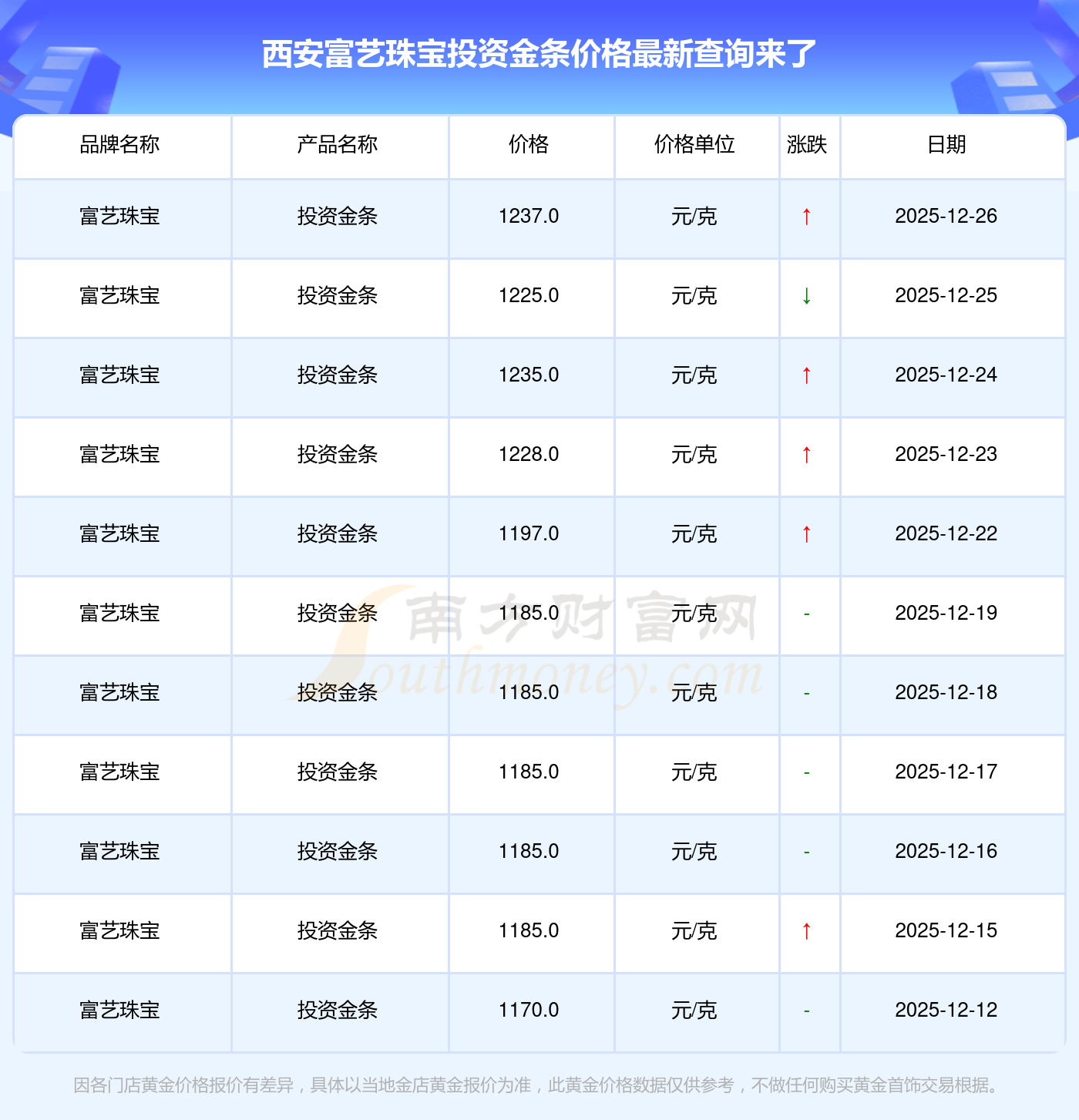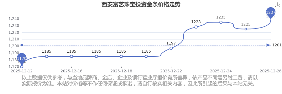 2025年12月27日,西安富藝珠寶投資金條每克的價(jià)值量定格在1237.0元/克。