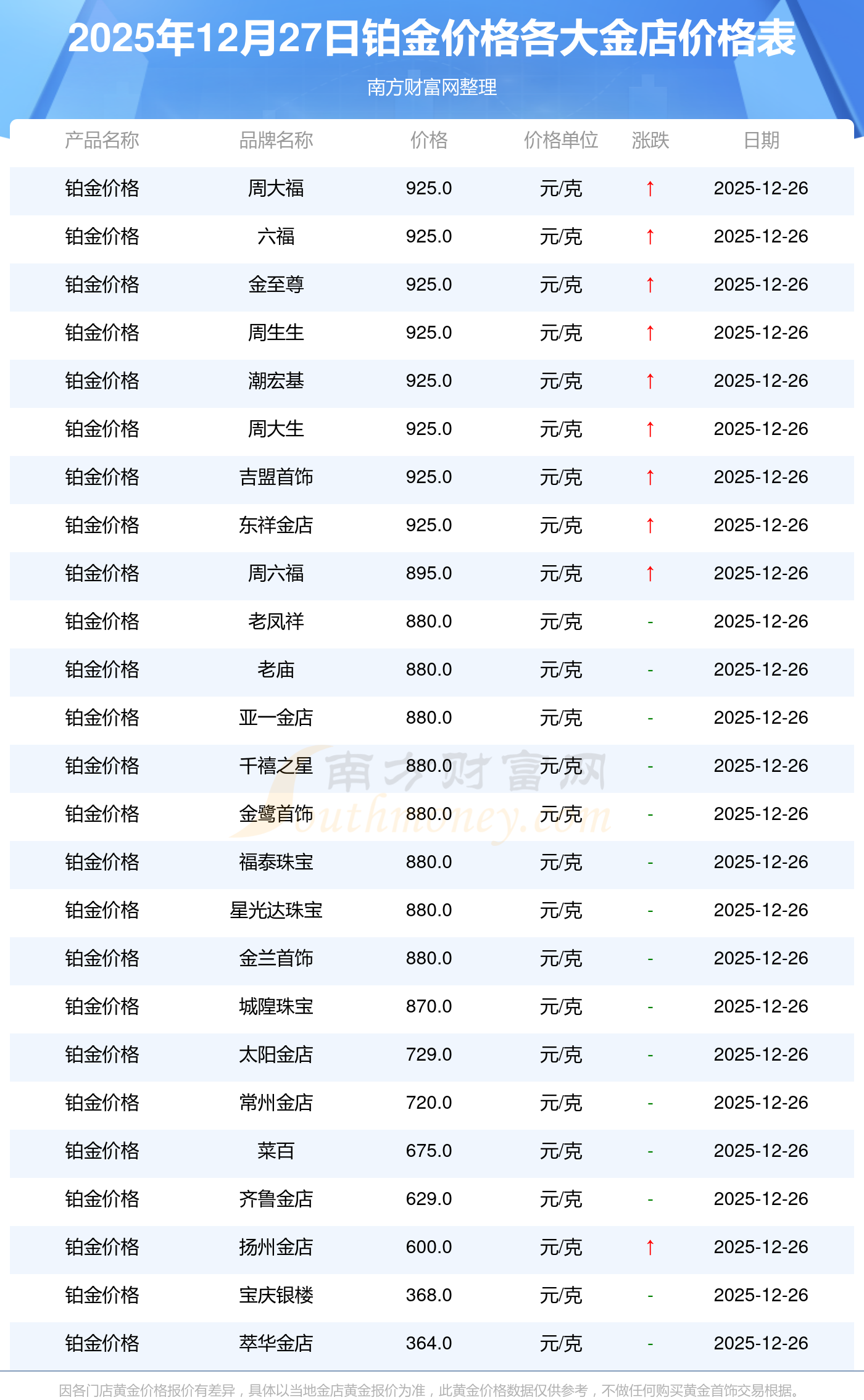 今天是2025年12月27日,周大福、老鳳祥、老廟、周生生、周大福、周大福、周大福、周大福、周大福、周大福、老鳳祥等各大金店品牌鉑金價格最新價格如下:周大福1398.0元/克、老鳳祥1413.0元/克、老廟1413.0元/克、周生生1407.0元/克、周大福925.0元/克、周大福1413.0元/克、周大福50280.0、周大福27110.0、周大福45210.0、周大福1239.0元/克、老鳳祥880.0元/克。