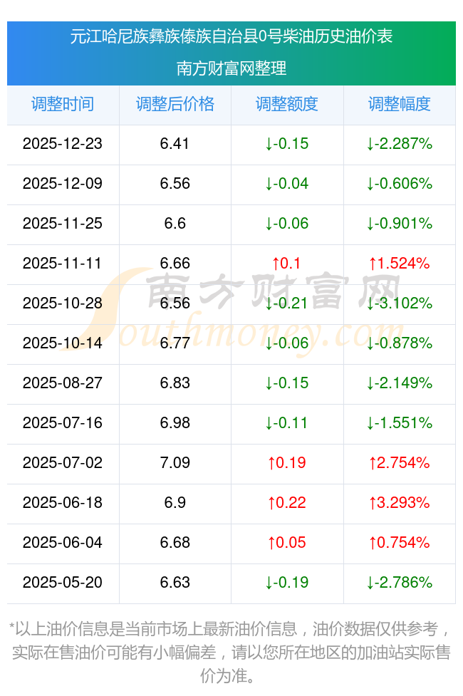 12月25日元江哈尼族彝族傣族自治縣0號(hào)柴油歷史油價(jià)調(diào)整一覽表