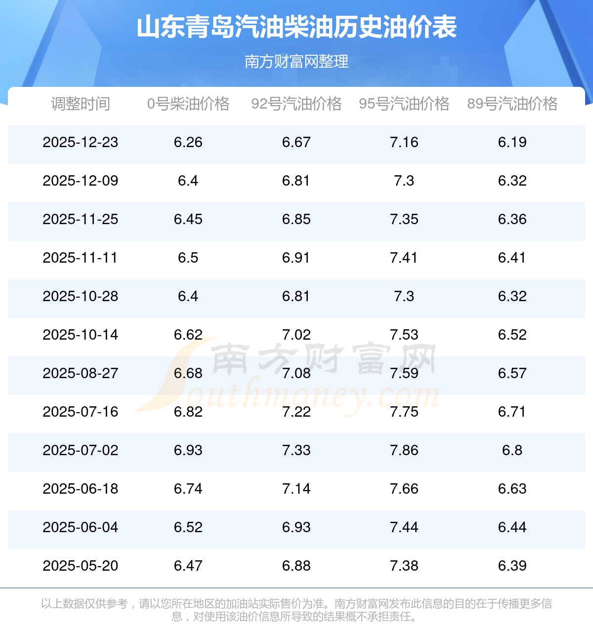 油價數(shù)據(jù)僅供參考,請以您所在地區(qū)的加油站報價為準。南方財富網(wǎng)發(fā)布此信息的目的在于傳播更多信息,對使用該油價信息所導致的結果概不承擔任何責任。