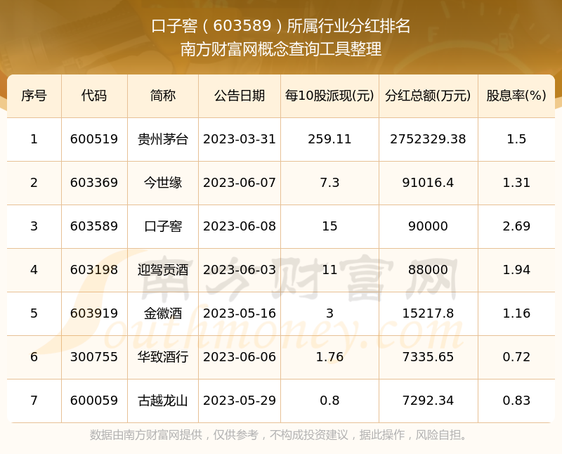 按照南方財(cái)富網(wǎng)趨勢(shì)選股系統(tǒng)統(tǒng)計(jì),口子窖所屬行業(yè)為白酒行業(yè),白酒行業(yè)分紅排名情況如下表: