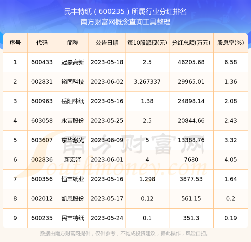 按照南方財(cái)富網(wǎng)趨勢選股系統(tǒng)統(tǒng)計(jì),民豐特紙所屬行業(yè)為造紙印刷行業(yè),造紙印刷行業(yè)分紅排名情況如下表: