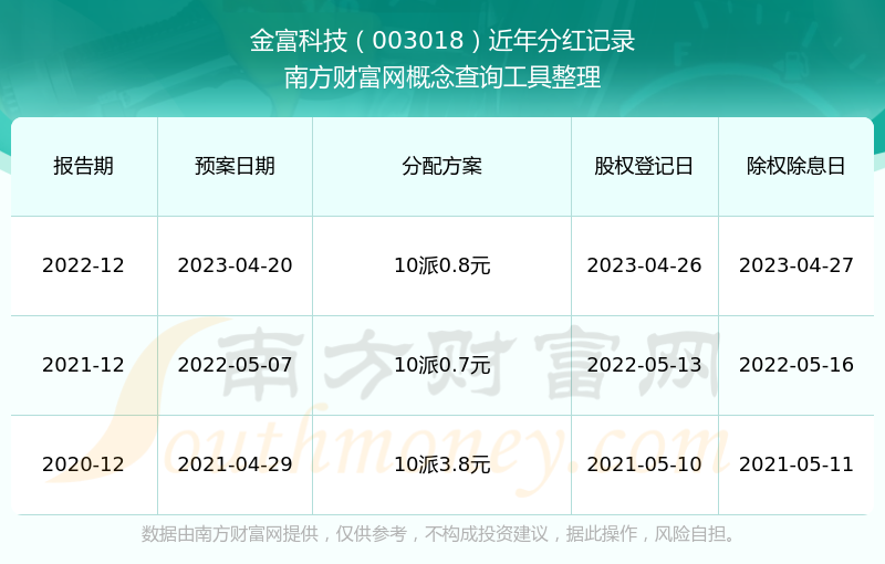 金富科技最新一次公布的分紅方案為10派0.8元。本次權(quán)益分派股權(quán)登記日為2023年4月26日,除權(quán)除息日為2023年4月27日,派息日為2023年4月27日。