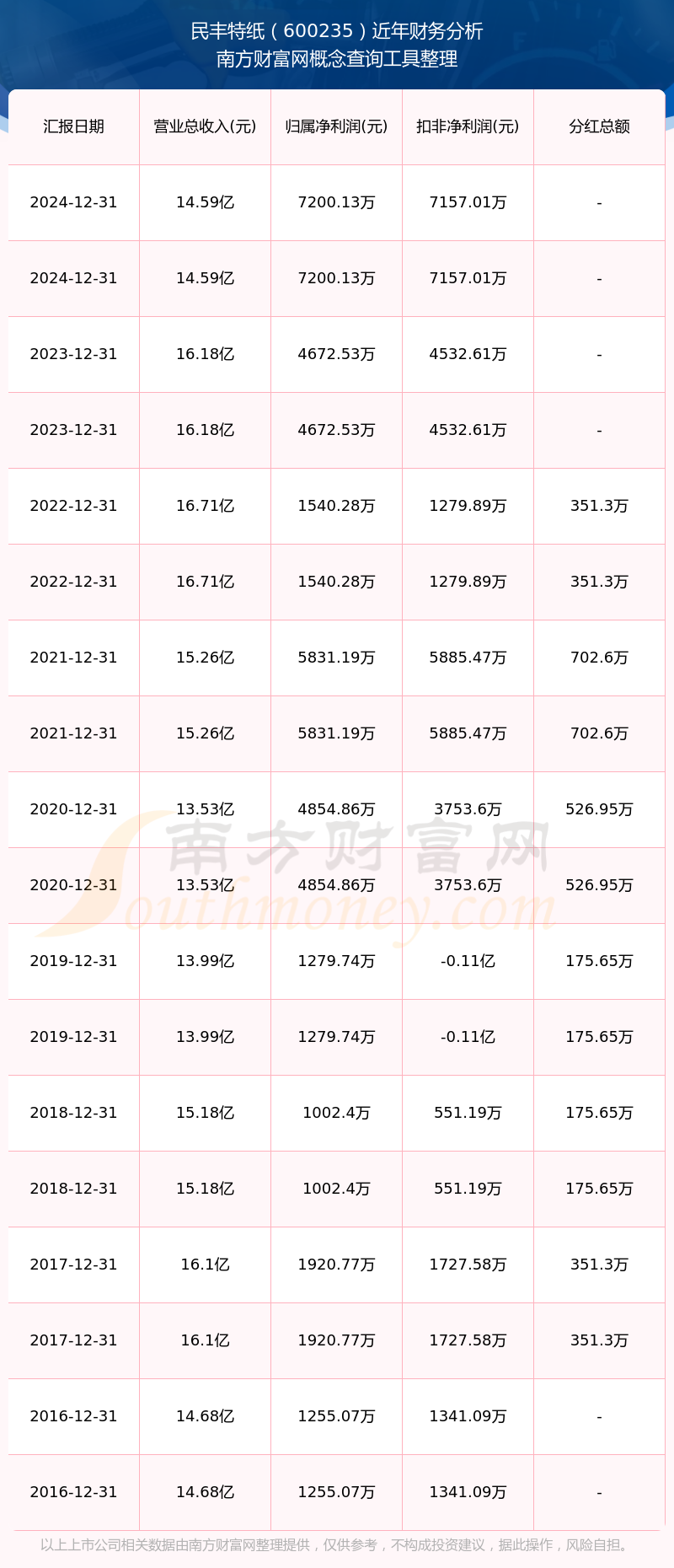 民豐特紙2024年總營(yíng)收14.59億,同比增長(zhǎng)-9.82%;凈利潤(rùn)7200.13萬(wàn),同比增長(zhǎng)54.09%;銷售毛利率16.51%。