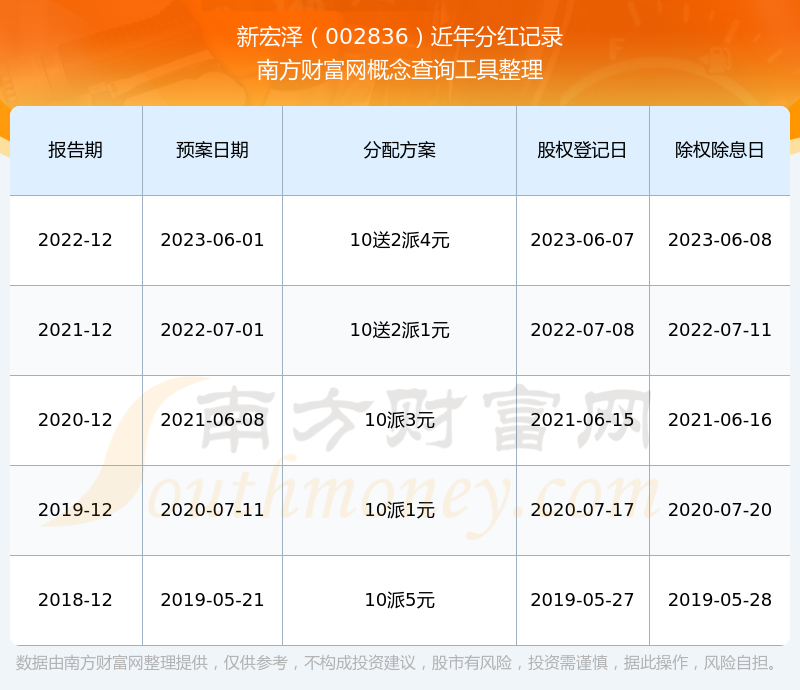 新宏澤最新一次公布的分紅方案:10送2派4元。