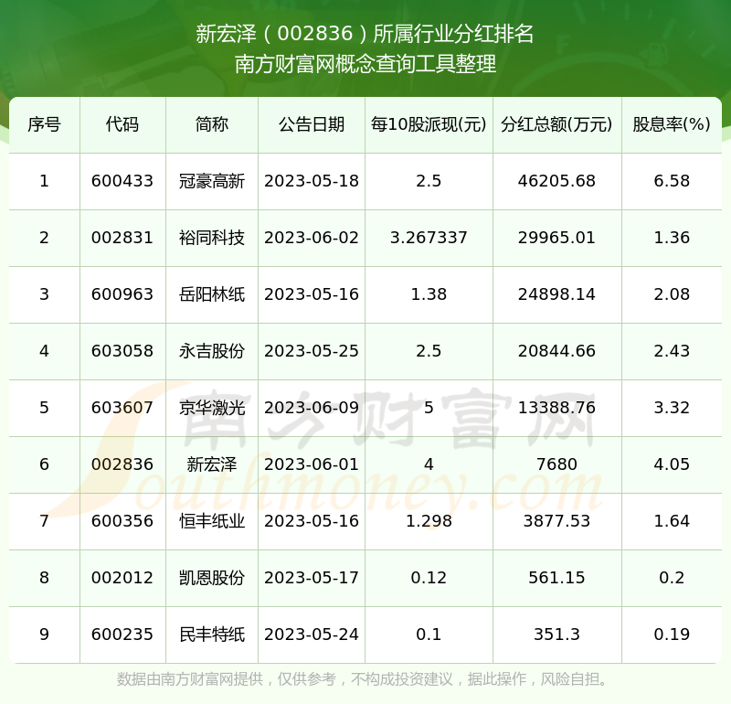 按照南方財富網趨勢選股系統(tǒng)統(tǒng)計,新宏澤所屬行業(yè)為造紙印刷行業(yè),造紙印刷行業(yè)分紅排名情況如下表: