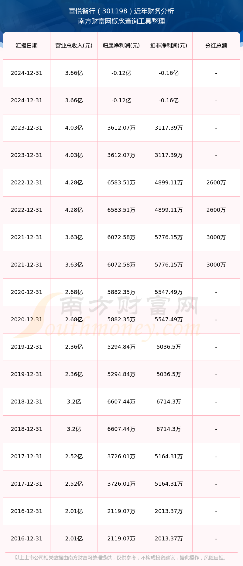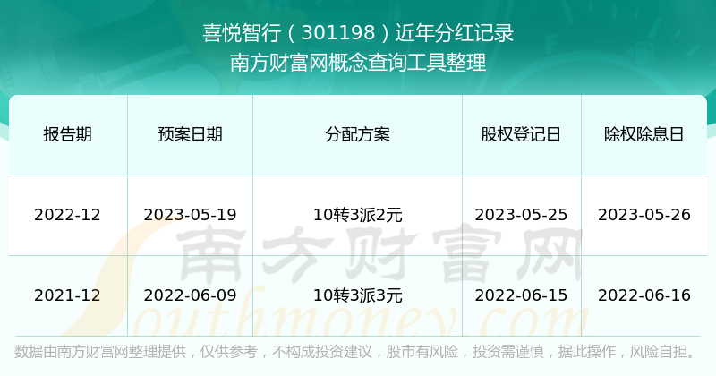 喜悅智行歷年分紅派息情況如下表所示: