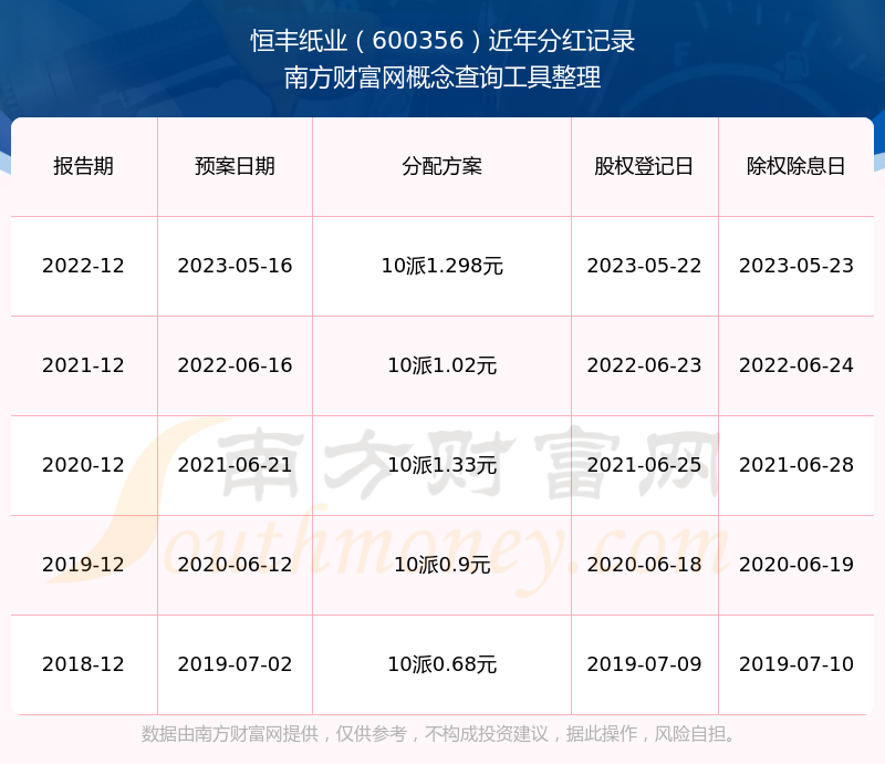 恒豐紙業(yè)最新一次公布的分紅方案為10派1.298元。本次權(quán)益分派股權(quán)登記日為2023年5月22日,除權(quán)除息日為2023年5月23日,派息日為2023年5月23日。
