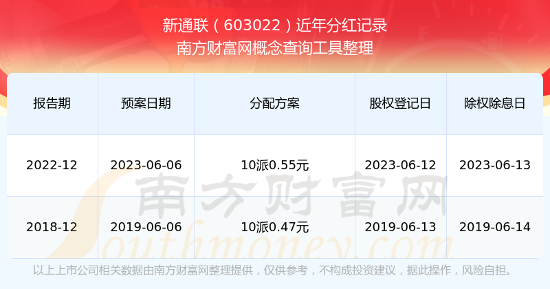 新通聯(lián)最新一次公布的分紅方案為10派0.55元。本次權(quán)益分派股權(quán)登記日為2023年6月12日,除權(quán)除息日為2023年6月13日,派息日為2023年6月13日。