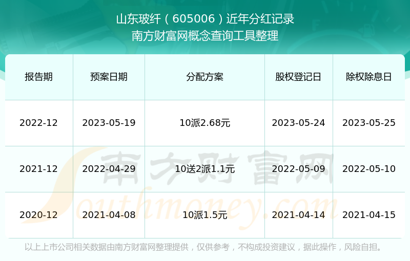 山東玻纖最新一次公布的分紅方案為10派2.68元。本次權(quán)益分派股權(quán)登記日為2023年5月24日,除權(quán)除息日為2023年5月25日,派息日為2023年5月25日。