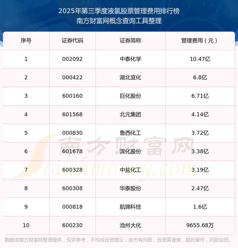 2025年第三季度,液氯股票管理費用排名如下:中泰化學(002092)的管理費用總額高達10.47億,湖北宜化(000422)和巨化股份(600160)位居第二和第三,北元集團(601568)、魯西化工(000830)、濱化股份(601678)、中鹽化工(600328)、華泰股份(600308)、航錦科技(000818)、滄州大化(600230)分別進入前十,其管理費用總額分別排名第4-10名。