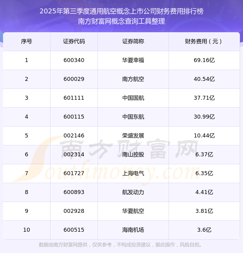 2025年第三季度,通用航空概念上市公司財(cái)務(wù)費(fèi)用排行榜中,華夏幸福(600340)財(cái)務(wù)費(fèi)用總額高達(dá)69.16億,南方航空(600029)和中國國航(601111)排名第二和第三,中國東航(600115)、榮盛發(fā)展(002146)、南山控股(002314)、上海電氣(601727)、航發(fā)動(dòng)力(600893)、華夏航空(002928)、海南機(jī)場(chǎng)(600515)進(jìn)入前十,財(cái)務(wù)費(fèi)用總額分別排名第4-10名。