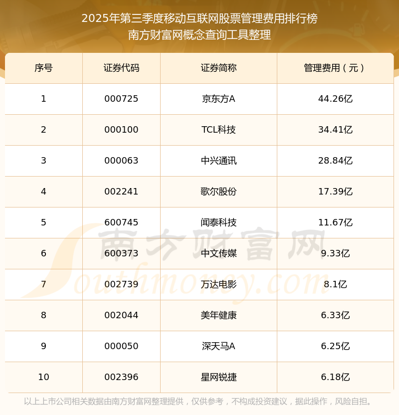 2025年第三季度,移動互聯(lián)網(wǎng)股票管理費(fèi)用排行榜中,京東方A(000725)的管理費(fèi)用總額高達(dá)44.26億,TCL科技(000100)和中興通訊(000063)分別位居第二和第三,歌爾股份(002241)、聞泰科技(600745)、中文傳媒(600373)、萬達(dá)電影(002739)、美年健康(002044)、深天馬A(000050)、星網(wǎng)銳捷(002396)分別進(jìn)入前十,其管理費(fèi)用總額分別排名第4-10名。