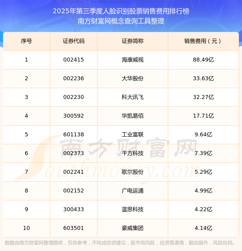 2025年第三季度,人臉識別股票銷售費用排行榜如下:?低暎002415)的銷售費用總額高達88.49億,大華股份(002236)和科大訊飛(002230)分別位居第二和第三,華凱易佰(300592)、工業(yè)富聯(lián)(601138)、千方科技(002373)、歌爾股份(002241)、廣電運通(002152)、藍思科技(300433)、豪威集團(603501)分別進入前十,其銷售費用總額分別排名第4-10名。