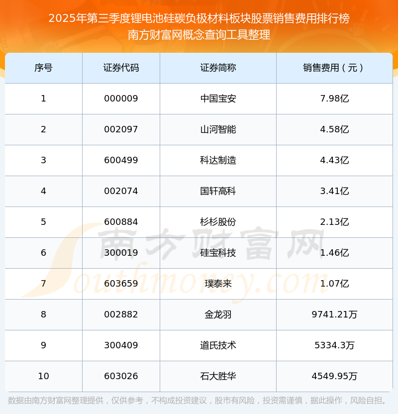 2025年第三季度鋰電池硅碳負(fù)極材料板塊股票銷售費(fèi)用排行榜如下:中國(guó)寶安(000009)的銷售費(fèi)用總額高達(dá)7.98億,山河智能(002097)和科達(dá)制造(600499)分別位居第二和第三,國(guó)軒高科(002074)、杉杉股份(600884)、硅寶科技(300019)、璞泰來(lái)(603659)、金龍羽(002882)、道氏技術(shù)(300409)、石大勝華(603026)分別進(jìn)入前十,其銷售費(fèi)用總額分別排名第4-10名。