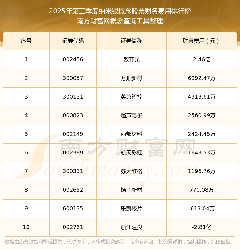 2025年第三季度納米銀概念股票財(cái)務(wù)費(fèi)用排行榜如下:歐菲光(002456)的財(cái)務(wù)費(fèi)用總額高達(dá)2.46億,萬順新材(300057)和英唐智控(300131)分別排名第二和第三,超聲電子(000823)、西部材料(002149)、航天彩虹(002389)、蘇大維格(300331)、揚(yáng)子新材(002652)、樂凱膠片(600135)、浙江建投(002761)分別進(jìn)入前十,其財(cái)務(wù)費(fèi)用總額分別排名第4-10名。