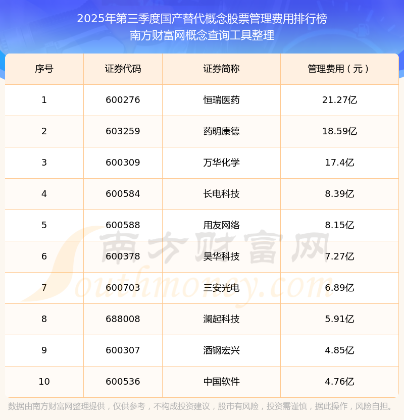 2025年第三季度,國(guó)產(chǎn)替代概念股票管理費(fèi)用排行榜如下:恒瑞醫(yī)藥(600276)的管理費(fèi)用總額高達(dá)21.27億,藥明康德(603259)和萬(wàn)華化學(xué)(600309)分別排名第二和第三,長(zhǎng)電科技(600584)、用友網(wǎng)絡(luò)(600588)、昊華科技(600378)、三安光電(600703)、瀾起科技(688008)、酒鋼宏興(600307)、中國(guó)軟件(600536)分別進(jìn)入前十,其管理費(fèi)用總額分別排名第4-10名。