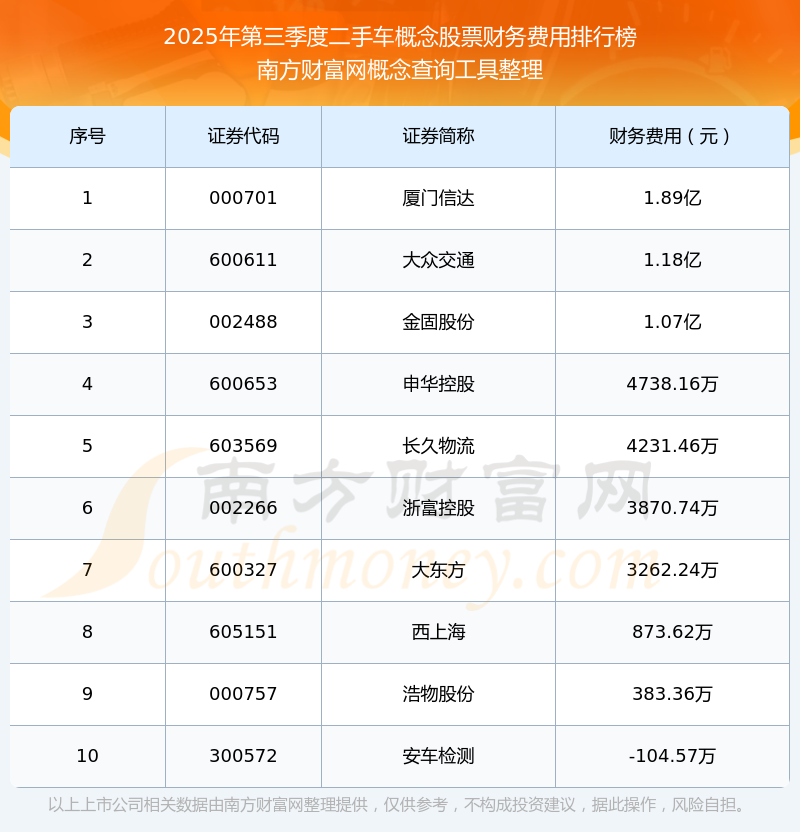 2025年第三季度,二手車概念股票財務費用排行榜中,廈門信達(000701)財務費用總額高達1.89億,大眾交通(600611)和金固股份(002488)排名第二和第三,申華控股(600653)、長久物流(603569)、浙富控股(002266)、大東方(600327)、西上海(605151)、浩物股份(000757)、安車檢測(300572)進入前十,財務費用總額分別排名第4-10名。