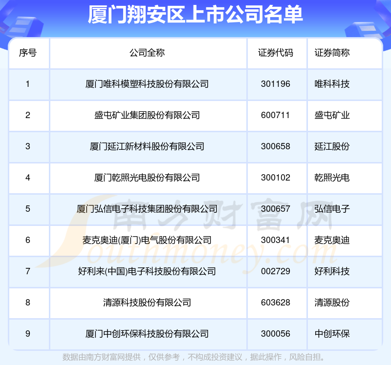 從數(shù)量來看,截至10月26日,廈門翔安區(qū)共有9家A股上市公司。具體分布為上海證券交易所:盛屯礦業(yè)、清源股份等2家,深圳證券交易所:好利科技、中創(chuàng)環(huán)保、乾照光電、麥克奧迪、弘信電子、延江股份、唯科科技等7家。