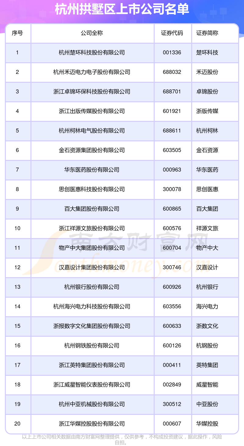 杭州拱墅區(qū)的上市公司都有哪些?南方財富網(wǎng)趨勢選股系統(tǒng)為您整理了歸屬于杭州拱墅區(qū),并且在A股上市的公司。