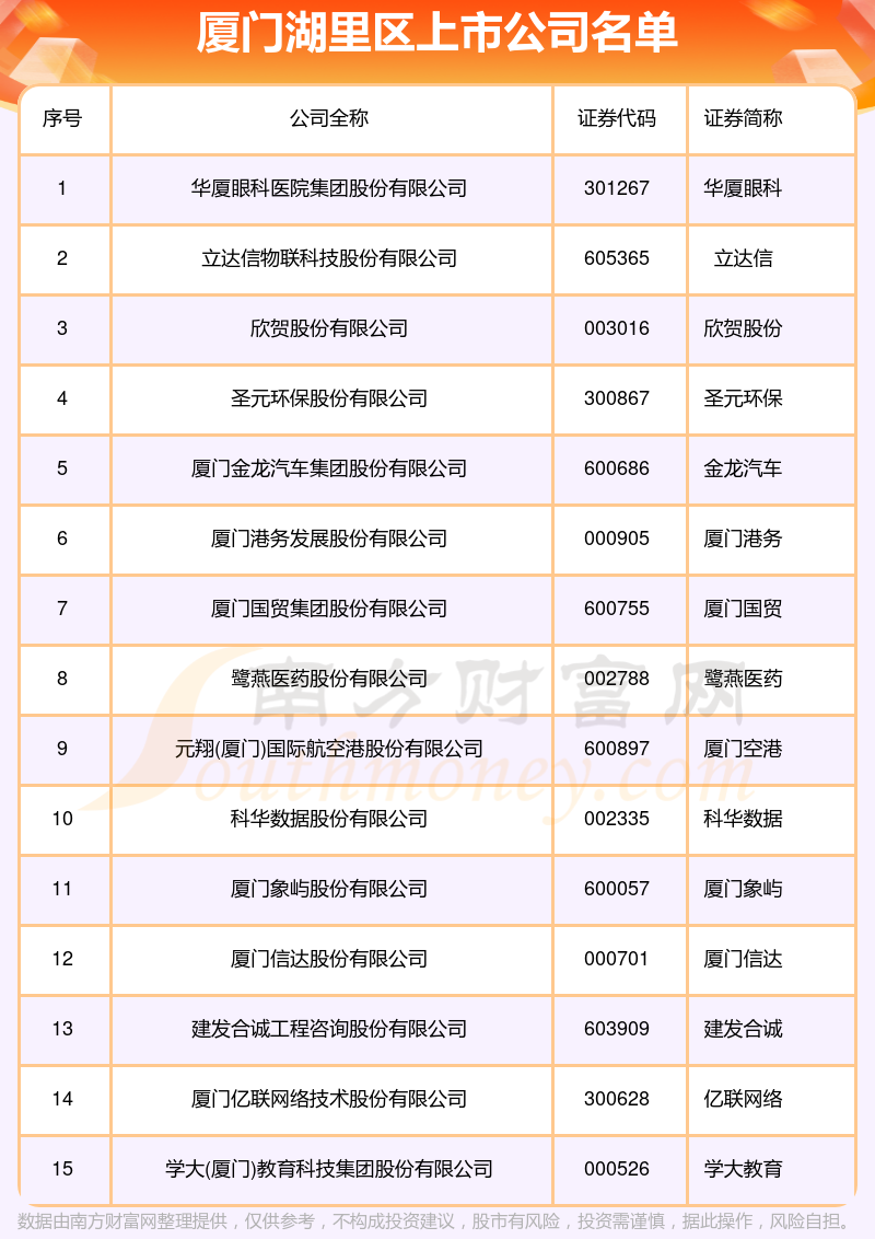 從數(shù)量來看,截至10月26日,廈門湖里區(qū)共有15家A股上市公司。具體分布為上海證券交易所:廈門象嶼、金龍汽車、廈門國貿(mào)、廈門空港、建發(fā)合誠、立達(dá)信等6家,深圳證券交易所:學(xué)大教育、廈門信達(dá)、廈門港務(wù)、科華數(shù)據(jù)、鷺燕醫(yī)藥、欣賀股份、億聯(lián)網(wǎng)絡(luò)、圣元環(huán)保、華廈眼科等9家。