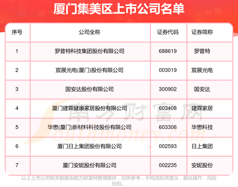 數(shù)量上,截至10月26日,廈門集美區(qū)共有7家A股上市公司。其中,上交所3家(華懋科技、建霖家居、羅普特等),深交所4家(安妮股份、日上集團(tuán)、宸展光電、國(guó)安達(dá)等)。