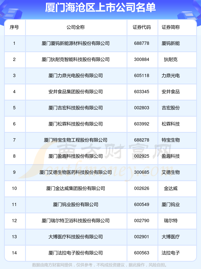 數(shù)量上來看,截至10月26日,廈門海滄區(qū)共有14家A股上市公司。其中,上交所7家(廈門鎢業(yè)、法拉電子、安井食品、松霖科技、力鼎光電、特寶生物、廈鎢新能等),深交所7家(金達(dá)威、瑞爾特、吉宏股份、大博醫(yī)療、盈趣科技、艾德生物、狄耐克等)。