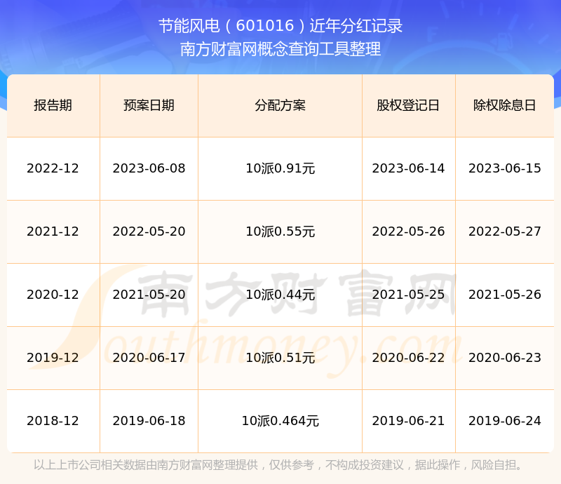 節(jié)能風電最新一次公布的分紅方案為10派0.91元。本次權益分派股權登記日為2023年6月14日,除權除息日為2023年6月15日,派息日為2023年6月15日。