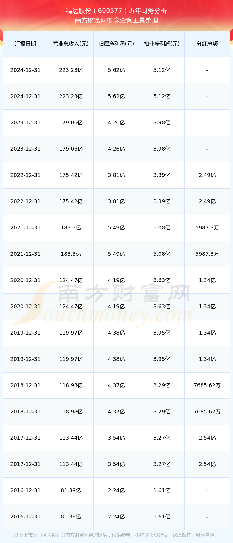 精達(dá)股份2024年總營收223.23億,同比增長24.67%;凈利潤5.62億,同比增長31.72%;銷售毛利率5.83%。
