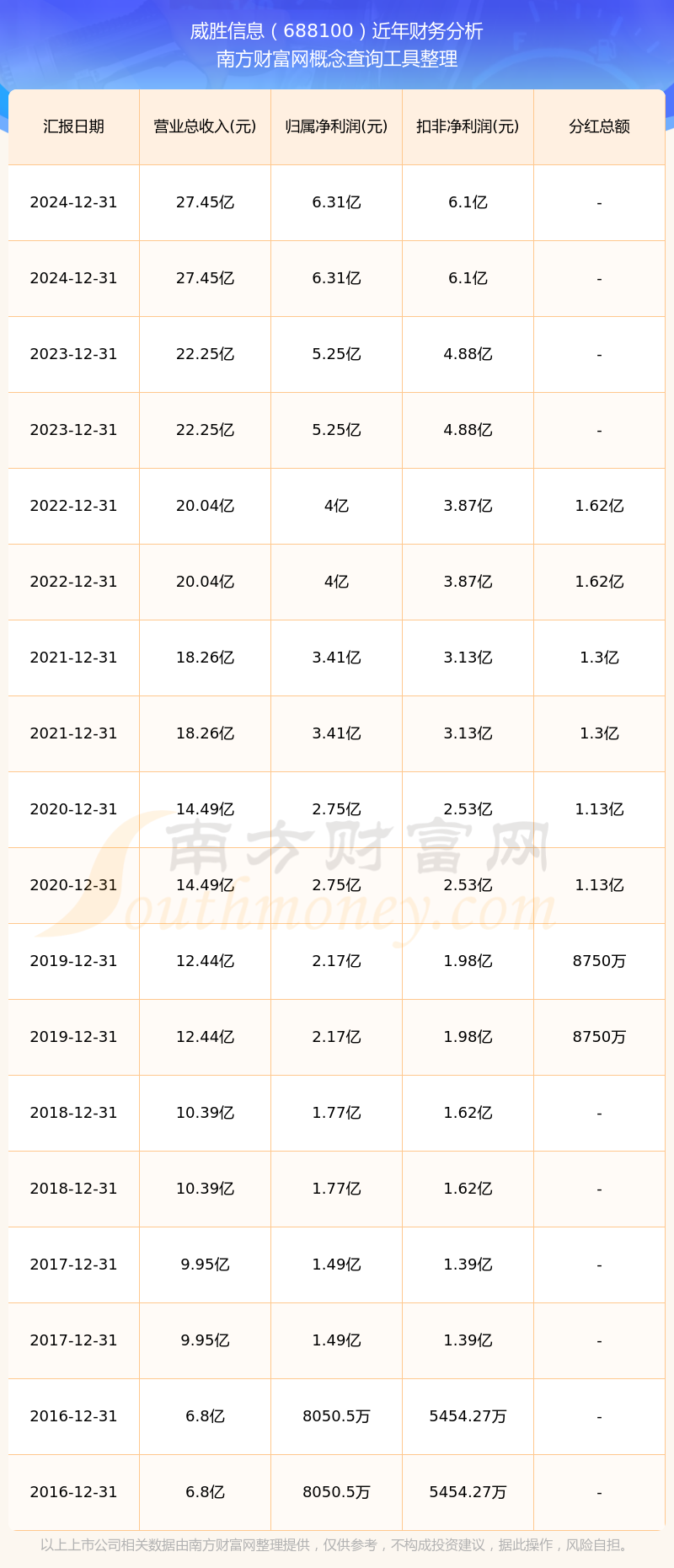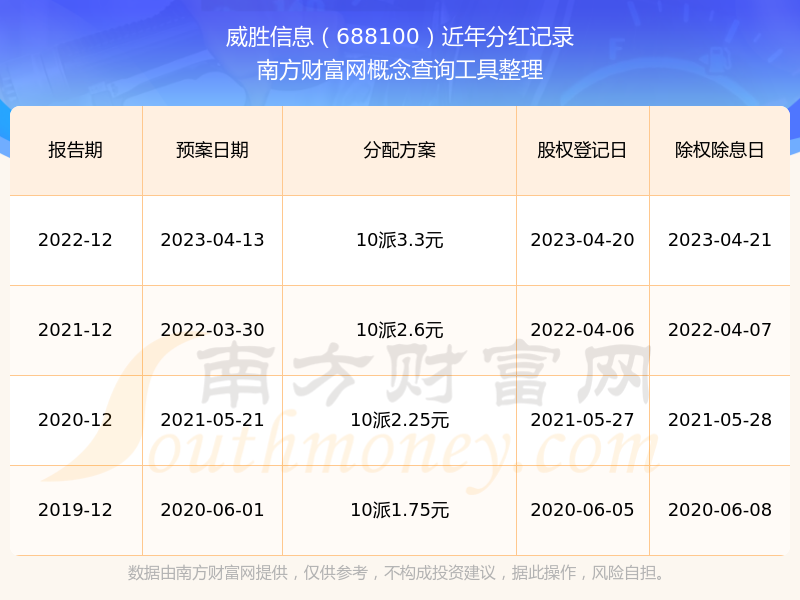 威勝信息最新一次公布的分紅方案為10派3.3元。本次權(quán)益分派股權(quán)登記日為2023年4月20日,除權(quán)除息日為2023年4月21日,派息日為2023年4月21日。