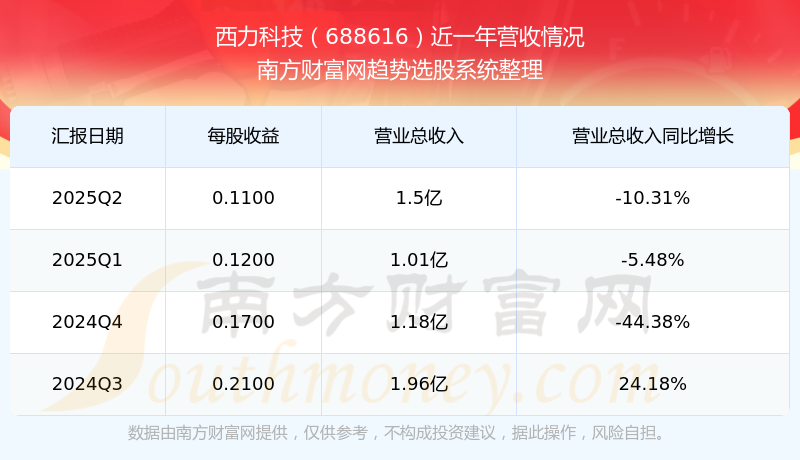 西力科技2025年第二季度公司實(shí)現(xiàn)營(yíng)業(yè)收入1.5億元,同比-10.31%;歸母凈利潤(rùn)1938.11萬元,同比-2.58%。