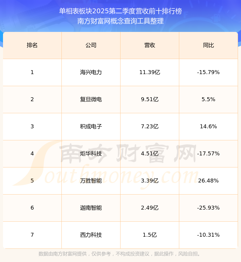 按照南方財(cái)富網(wǎng)概念查詢工具統(tǒng)計(jì),該股所屬板塊為單相表板塊,該板塊共有7只股票,西力科技2025第二季度營(yíng)收在該板塊中排名為第7名,該板塊2025第二季度營(yíng)收排名前十的股票如下表:
