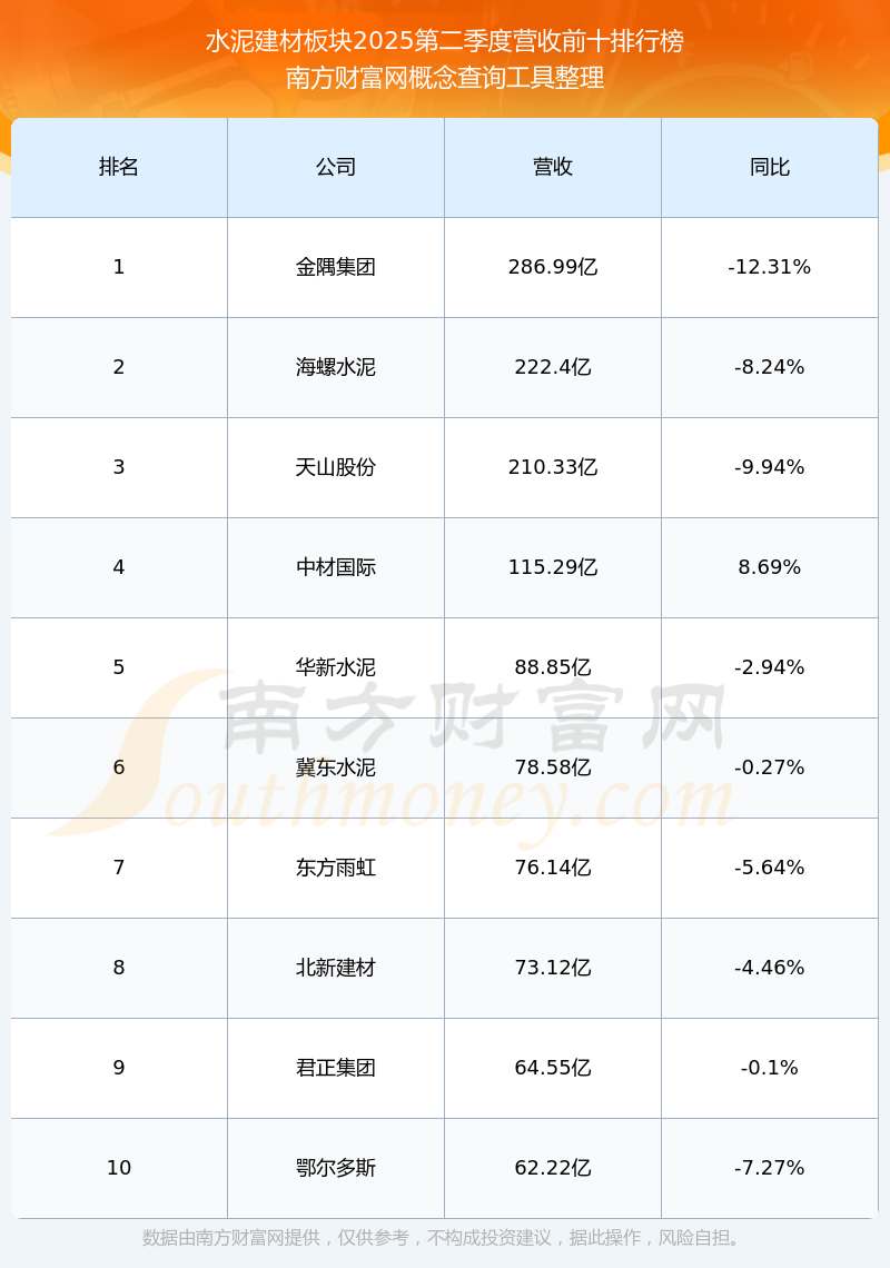 按照南方財(cái)富網(wǎng)概念查詢工具統(tǒng)計(jì),該股所屬板塊為水泥建材板塊,該板塊共有48只股票,杭蕭鋼構(gòu)2025第二季度營收在該板塊中排名為第14名,該板塊2025第二季度營收排名前十的股票如下表: