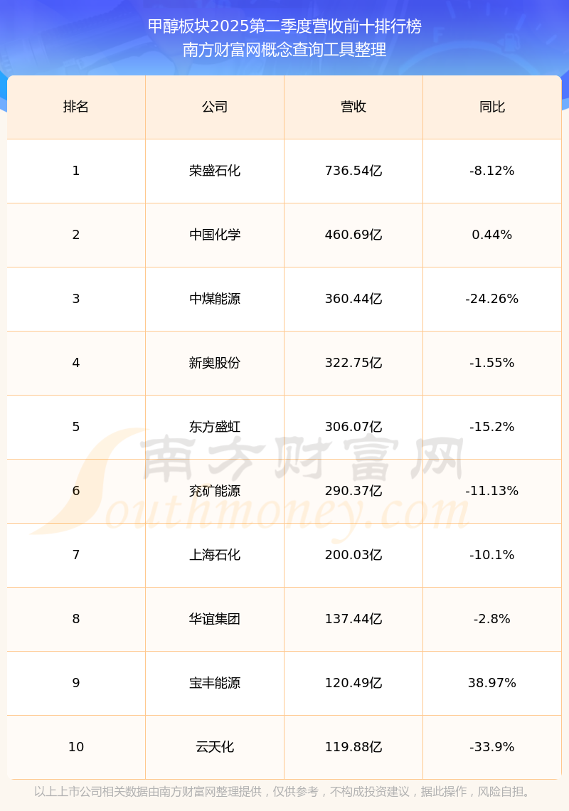 按照南方財(cái)富網(wǎng)概念查詢(xún)工具統(tǒng)計(jì),該股所屬板塊為甲醇板塊,該板塊共有59只股票,金;2025第二季度營(yíng)收在該板塊中排名為第56名,該板塊2025第二季度營(yíng)收排名前十的股票如下表: