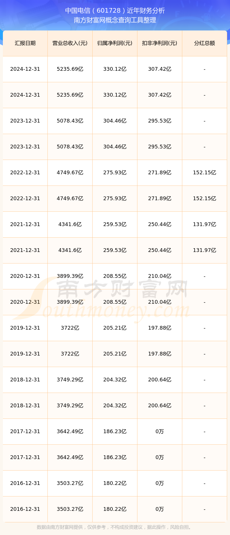 中國(guó)電信公司2024年實(shí)現(xiàn)營(yíng)業(yè)收入5235.69億元,同比增長(zhǎng)3.1%;凈利潤(rùn)330.12億元,同比增長(zhǎng)8.43%;毛利率28.66%。