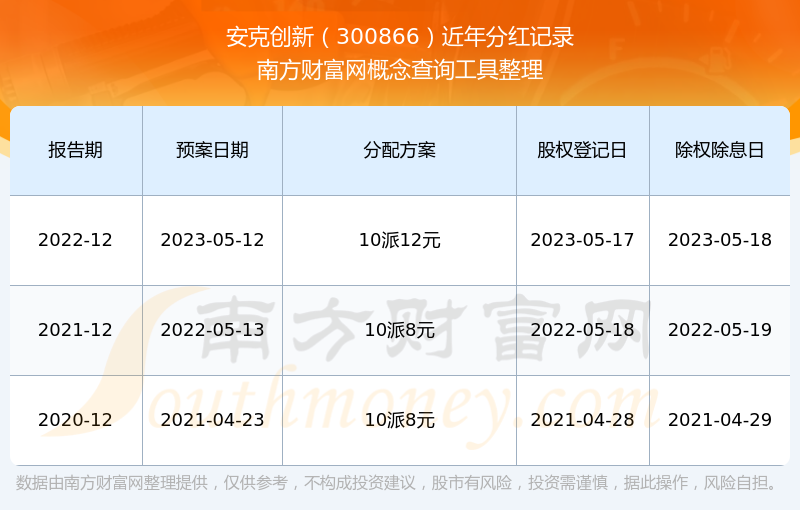 安克創(chuàng)新最新一次公布的分紅方案為10派12元。本次權(quán)益分派股權(quán)登記日為2023年5月17日,除權(quán)除息日為2023年5月18日,派息日為2023年5月18日。